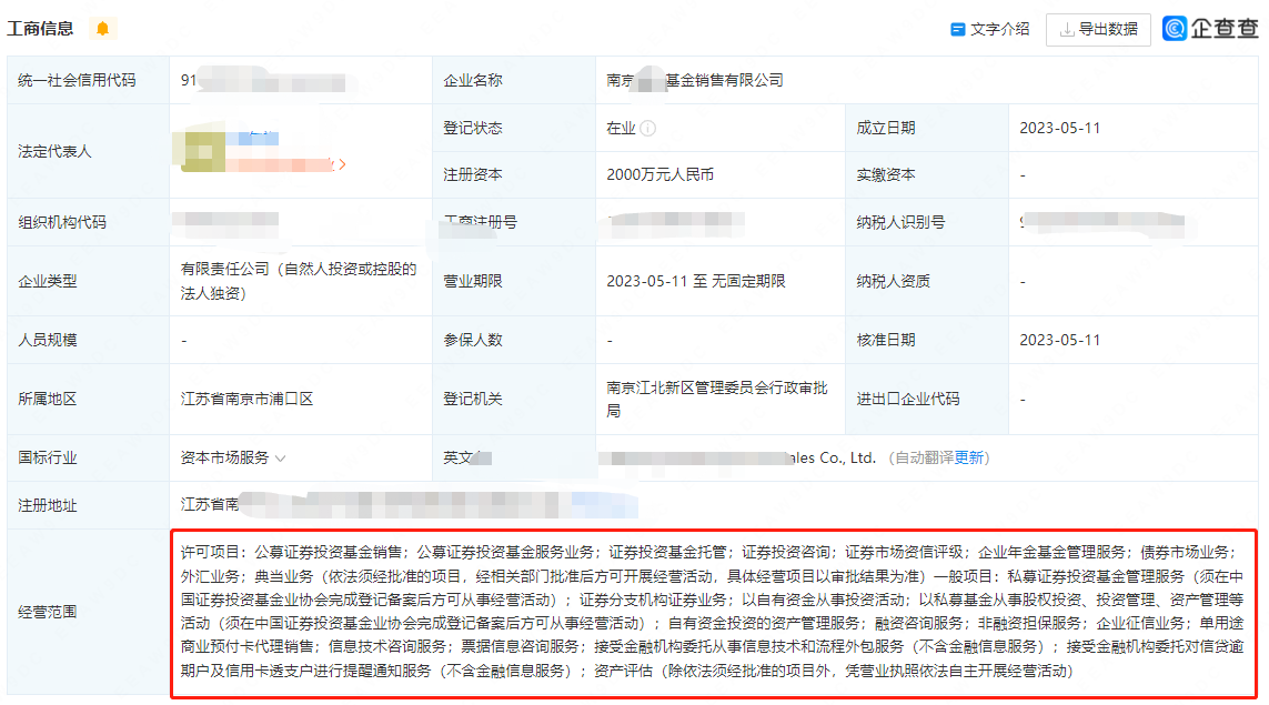 经营范围如下: 许可项目:公募证券投资基金销售;公募证券投资基金服务业务;证券投资基金托管;企业年金基金管理服务;证券投资咨询;债券市场业务;公募基金管理业务(依法须经批准的项目,经相关部门批准后方可开展经营活动,具体经营项目以审批结果为准) 一般项目:证券财务顾问服务;以私募基金从事股权投资、投资管理、资产管理等活动(须在中国证券投资基金业协会完成登记备案后方可从事经营活动);私募股权投资基金管理、创业投资基金管理服务(须在中国证券投资基金业协会完成登记备案后方可从事经营活动);以自有资金从事投资活动;融资咨询服务;资产评估;自有资金投资的资产管理服务;接受金融机构委托从事信息技术和流程外包服务(不含金融信息服务);私募证券投资基金管理服务(须在中国证券投资基金业协会完成登记备案后方可从事经营活动);非融资担保服务(除依法须经批准的项目外,凭营业执照依法自主开展经营活动)