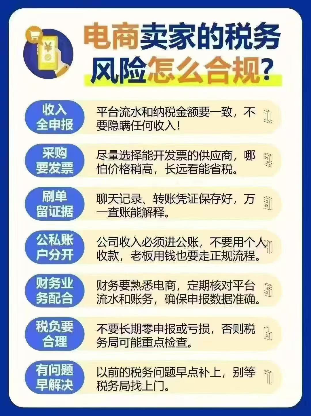 收入 平台流水和纳税金额要一致,不 全申报 要隐瞒任何收入! 采购 尽量选择能开发票的供应商,哪 要发票 怕价格稍高,长远看能省税。 刷单 聊天记录、转账凭证保存好,万 留证据 一查账能解释。 公私账 公司收入必须进公账,不要用个人 户分开 收款,老板用钱也要走正规流程。 财务业 财务要熟悉电商,定期核对平台 务配合 流水和账务,确保申报数据准确。 税负要 不要长期零申报或亏损,否则税 合理 务局可能重点检查。 有问题 以前的税务问题早点补上,别等 早解决 税务局找上门。