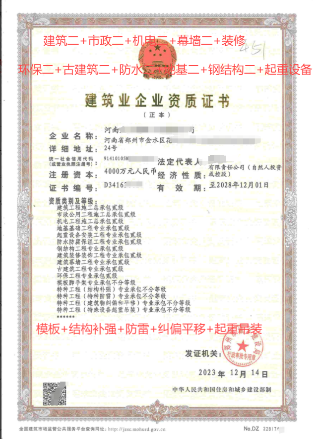 2.郑州:建筑二+市政二+机电总包二+地基基础二+起重设备安装+防水二+钢结构二+古建筑二+环保二+幕墙二+装修二+模板+特种防雷+结构补强+纠偏平移+特殊设备起重吊装+现成安许