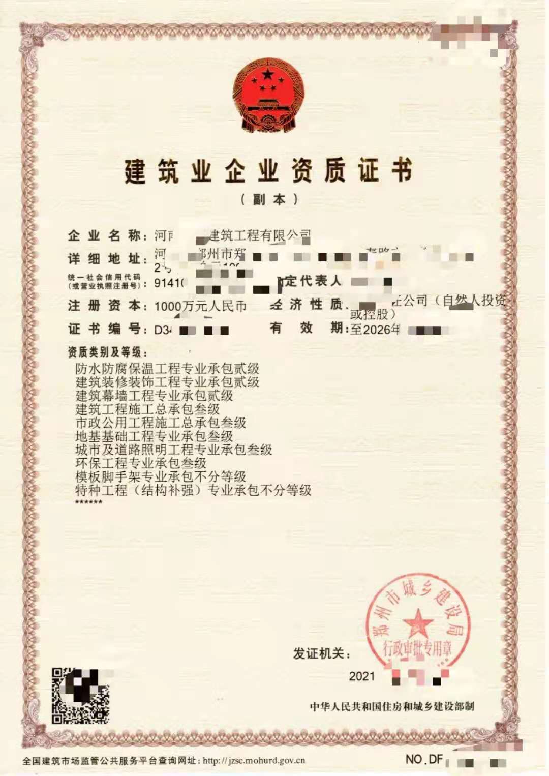 河南房建市政机电三总包施工资质建筑公司股权转让 21年公司成立,于7、8月左右成功办理资质书,安全生产许可现已公告领取! 公司全新未经营、无任何隐藏债务纠纷或法律诉讼、社保税务等工商一切可查询,真正做到买的放心卖的省心! 资质明细: 郑州 建筑施工总包三级+市政总承包叁级+机电施工总包三级+防水二级+装修二级+地基三级+照明三级+环保三级 现成安许 郑州 建筑施工总包三级+市政总承包叁级+防水二级+装修二级+钢结构三级+环保三级 现成安许 郑州 建筑施工总包三级+机电施工总包三级+防水二级+装修二级+钢结构三级+环保三级+幕墙二级+特种工程四项 现成安许 郑州 建筑施工总包三级+市政总承包叁级+装修二级+钢结构三级 现成安许 周口:市政总承包叁级+建筑施工总包三级+地基基础专包贰级+钢构叁级 现成安许 开封:市政总承包三级 现成安许 市政总承包三级+房建总承包叁级+地基三级+防水二级 现成安许 兰考:市政总承包三级+房建总承包叁级 现成安许 两套 平顶山:市政总承包三级+环保三级 现成安许 房建+机电+市政总承包叁级+劳务/环保 现成安许 以上资质全部包变更手续,迁出及落地! 建筑的对象大到包括区域规划、城市规划、景观设计等等综合的环境设计构筑、社区形成前的相关营造过程,小到室内的家具、小物件等的制作。而其通常的对象为一定场地内的单位。 在建筑学和土木工程的范畴里,“建筑”是指兴建建筑物或发展基建的过程。一般来说,每个建筑项目都会由专案经理和建筑师负责统筹,由各级的承建商、分判商、工程顾问、工料测量师、结构工程师等专业人员(专业人士)负责监督。