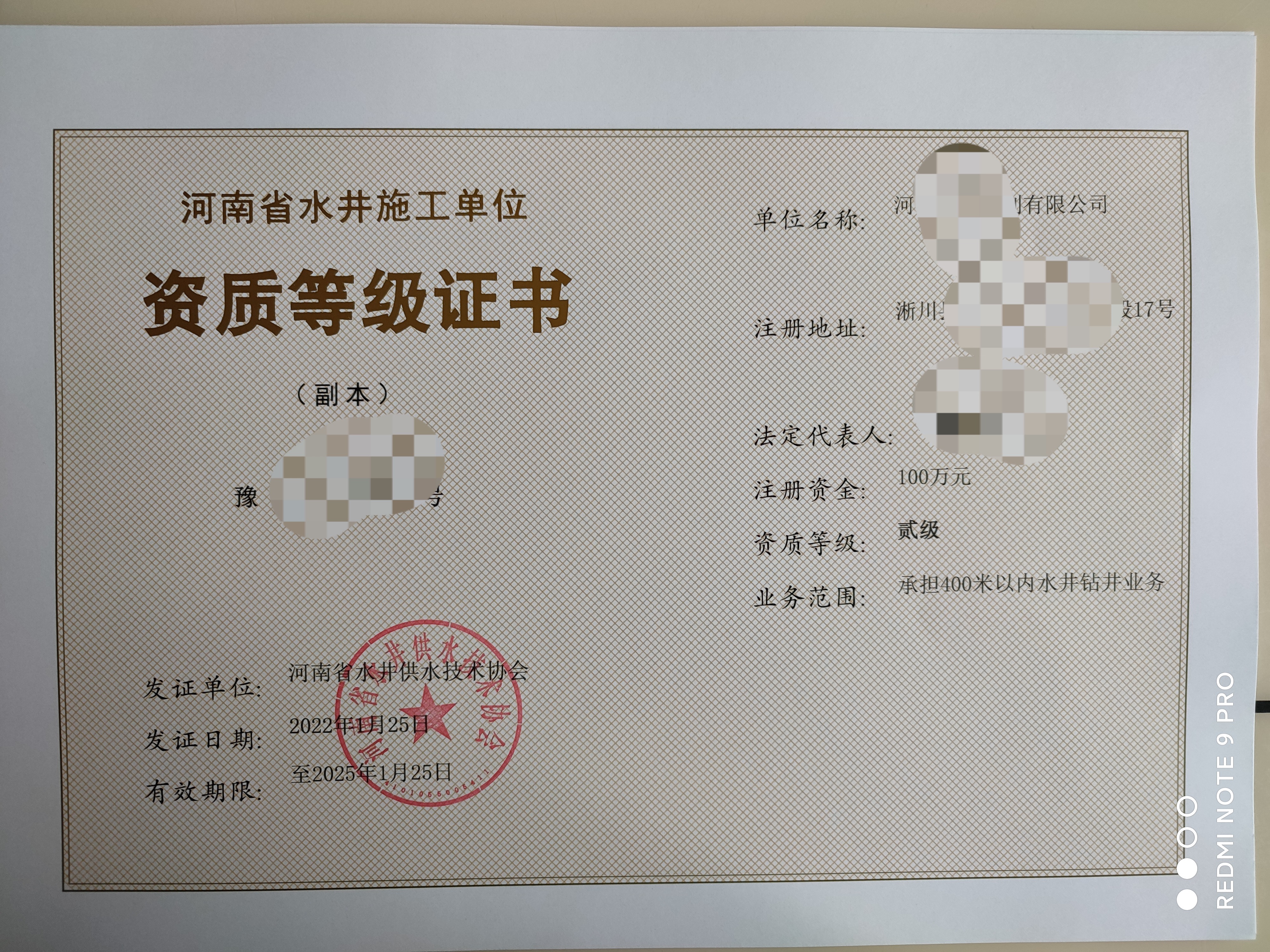 代办河南省内凿井资质一级,二级直接办理一周出证 凿井资质分为;一级,二级 一级,二级凿井资质直接办理,手续简单可全省接单-悦达集团!!! 一级水井施工单位应具备以下条件: 1、具备独立法人资格。 2、注册资金200万元以上。 3、拥有承担深度大于400m的水井的钻机及配套的泥浆泵、洗井、事故处理等设备,机械设备运行性能良好。 4、有从事水井施工工作5年以上的中级职称技术人员2人以上,并至少有1人熟悉水文地质业务;有10年以上钻井工龄的技师5人以上。 5、拥有物探找水仪器设备及操作技术人员,能够熟练运用物探设备探测地下水含水层埋藏深度,确定合理的开采深度,并能估算出水井出水量。 6、具有承担水井钻机、洗井设备等的维修技术力量和相应设备。 7、有上述条件要求的工作业绩。 8、有完善的管理制度。