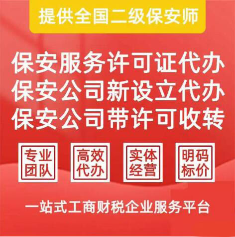 注册保安公司申请《保安服务许可证》的3大硬性条件: 第一,保安公司不同于其他公司,对注册资本做了限定,注册资金需达到100万元。所以想注册保安公司首先要准备好充足的资本。 第二,要有3名二级保安师证。申请《保安服务许可证》必须要有3名二级保安师人员,其中一名二级保安师为法人或高层管理员。也就是说,法人或高层管理人员必须有相关保安从业经验,而且要有二级保安师资格证。 第三,场地也有严格规定。 我司特色服务:0元代办营业执照,公司注册,各类许可证代办,公司注销变更,全程无需本人到场,1-3天拿证