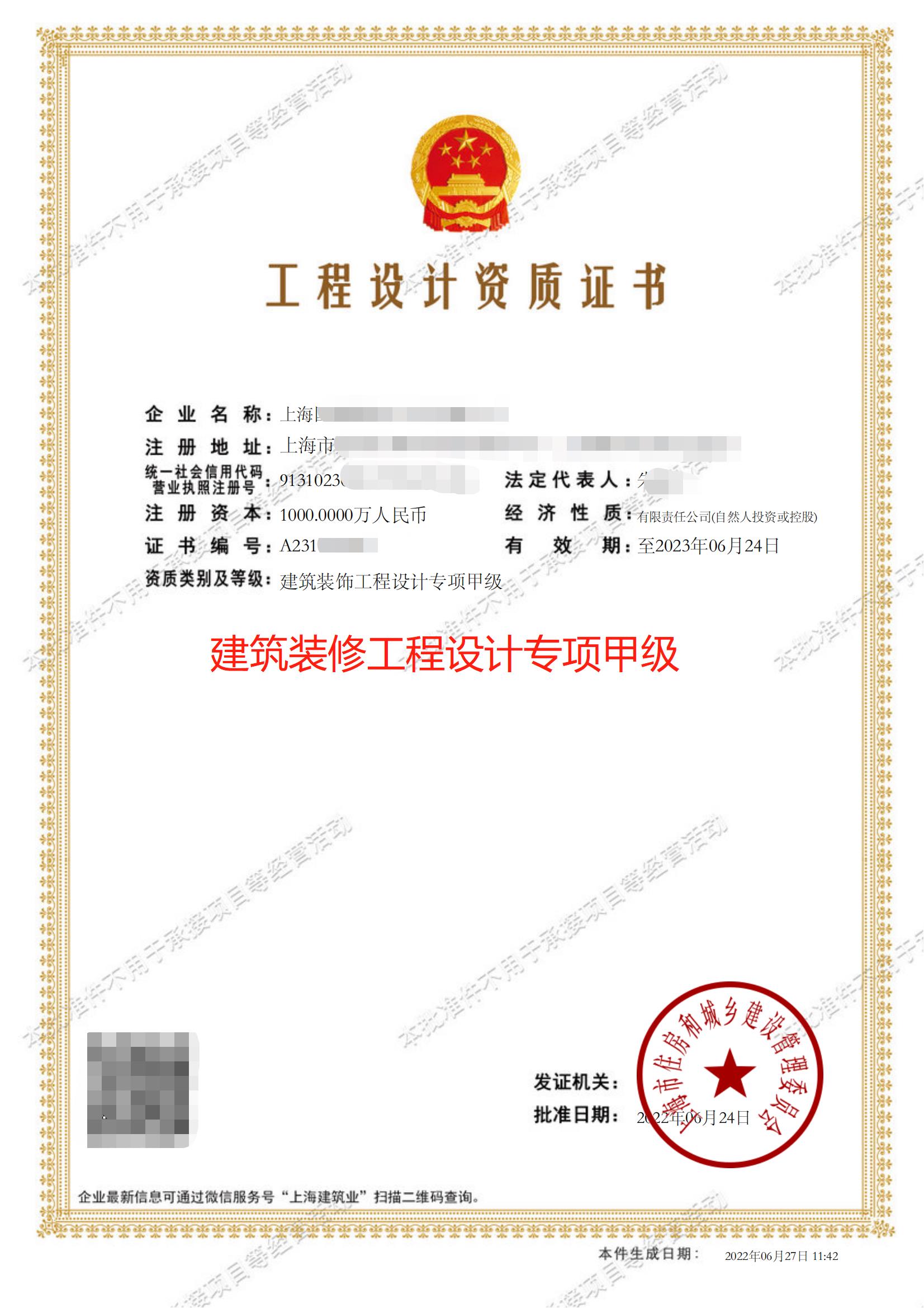 装饰设计甲级最高等级资质,建筑设计、装修装饰的老板们不容错过,现超低价转让,有意电话,全上海可做。另有专包一级资质可吸收合并,部分二级资质可新办,欢迎询价