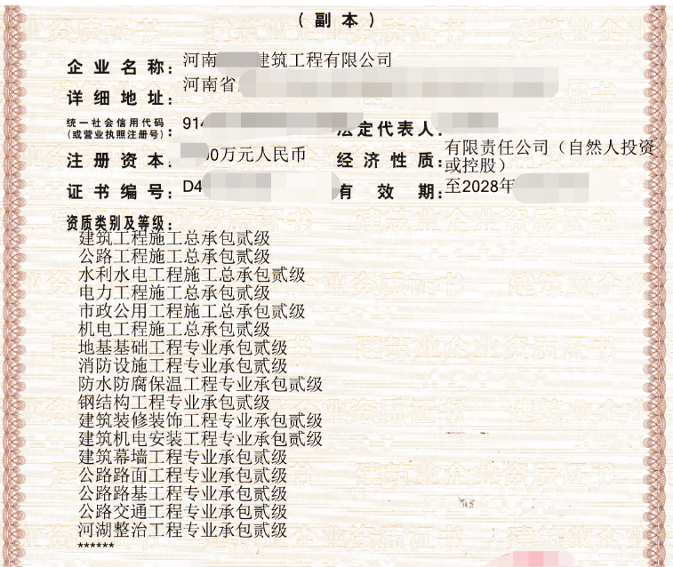 专注河南水务的水利水电河湖整治二级资质 详询马经理:15713818827 河南各市、县、区每个地方均由独立水利部门承担水利水电、水务相关项目,负责项目的实施,需要具有技术职称、项目经理及专业素养达到的人员,除了以上人员,更需要资质,资质是承揽项目实施的准入门槛资格,资质是首位,没有资质有再多人员仍无法揽接项目施工。国家对于资质的要求设定了统一标准,一级、二级和三级分别可承接不同范围的施工。资质有多种方式取得,股权收购公司、设立公司办理、重组分立、吸收合并等等,可详询我司具体实施方案! 现河南,水利水电工程总承包施工二级资质,是办理起始等级,三级资质已取消办理申请,现有三级资质还可在有效期内继续使用,有效期过后按照二级标准办理延期手续后,发放二级资质! 水利水电工程总承包二级资质标准: 1、企业资产 :净资产4000万元以上; 2、技术负责人具有8年以上从事工程施工技术管理工作经历,且具有水利水电工程相关专业高级职称或水利水电工程专业一级注册建造师执业资格; 3、其余人员标准和技术装备按照三级执行! 多种方案,多种选择,可一口价格全包含:人员、社保、过件均含!企业全方位手续方方面面照顾到,企业可放心全权交于我司办理约定事项!工商营业执照、社保、税务、资质、安许及银行开户等经营手续,我司均可一站式服务! 企业仅需提供告知我司,在哪里办,办什么资质,要求多长时间拿到,即可!另,我司提供后续配套服务,三体系认证、银行开户、代理记账、项目经理技术负责人八大员等施工相关人员证件的招聘! 各省、自治区住房城乡建设厅,直辖市建委,新疆生产建设兵团住房城乡建设局,国务院建设司(局),中央管理的有关企业: 为深入推进建筑业“放管服”改革,决定进一步简化《建筑业企业资质标准》部分指标,取消建筑业企业最低等级资质标准中关于持有岗位证书现场管理人员的指标考核。各级住房城乡建设主管部门要进一步加强事中事后监管,规范建筑市场秩序,保障工程质量安全。 本通知自印发之日起施行。中华人民共和国住房和城乡建设部办公厅2018年11月5日
